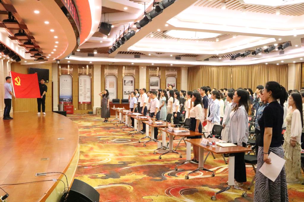 在专职组织员陈慧昀的领誓下,全场党员面向党旗,新接收预备党员集体入党宣誓,全体党员重温入党誓词。
