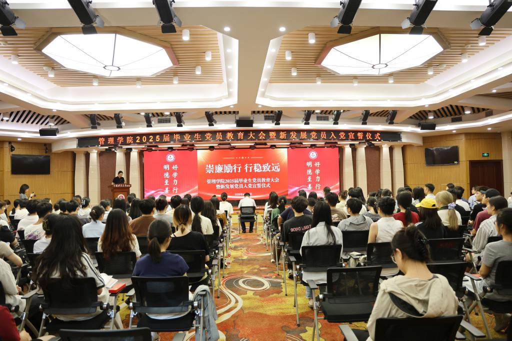 6月25日,管理学院147名2025届毕业生党员在福中苑报告厅上了一堂特殊的“毕业课”。这场以“崇廉励行 行稳致远”为主题的廉洁教育活动,通过专题报告、精神宣讲、仪式教育等形式,为即将步入社会的青年党员上了一堂生动的廉政党课。校党委常委、副校长汪文生出席活动并讲话。