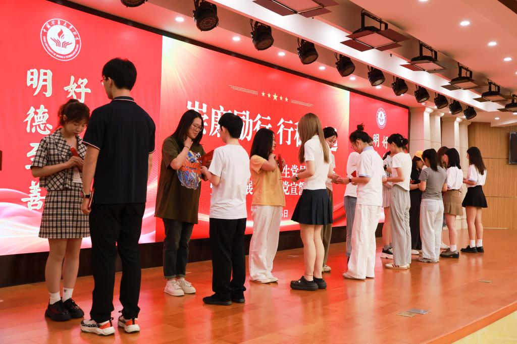 活动现场举行庄重的党徽传递仪式。学院党委书记高洁带领新老党员代表登台,台上、台下的毕业生党员代表分别为新接收35名预备党员佩戴党徽,并赠送镌刻入党誓词的政治生日贺卡。预备党员回赠廉洁书签,书签背面写有“心中有尺 行事有度”的烫金箴言。