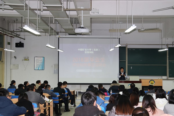本网讯 2017年12月8日,管理学院2018届毕业生毕业流程、就业政策与手续讲解大会于教学楼B115顺利召开,管理学院副院长宁云才、研究生教学秘书李超英、学生工作办公室主任、研究生辅导员崔艳娜作为主讲人进行讲解,全体2018届毕业研究生参与此次大会。