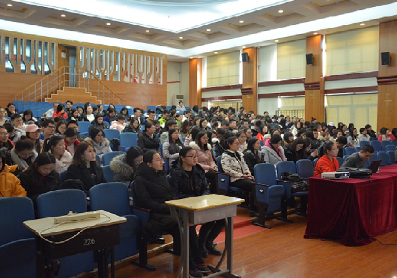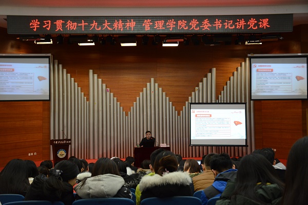 本网讯 为及时准确把握党的十九大精神,勉励学生党员不忘初心,牢记使命,不断提振精神状态,改进学生工作,12月12日下午14时30分,管理学院于民族楼407成功开展了“学习贯彻十九大精神,管理学院党委书记讲党课”活动。管理学生党委书记杨庆舟主讲,党委秘书、学生工作办公室主任崔艳娜主持,团委书记李烁玮,本科生辅导员鲁金华出席,管理学院全体学生党员、预备党员、2017年第2期入党积极分子300余人参与学习。