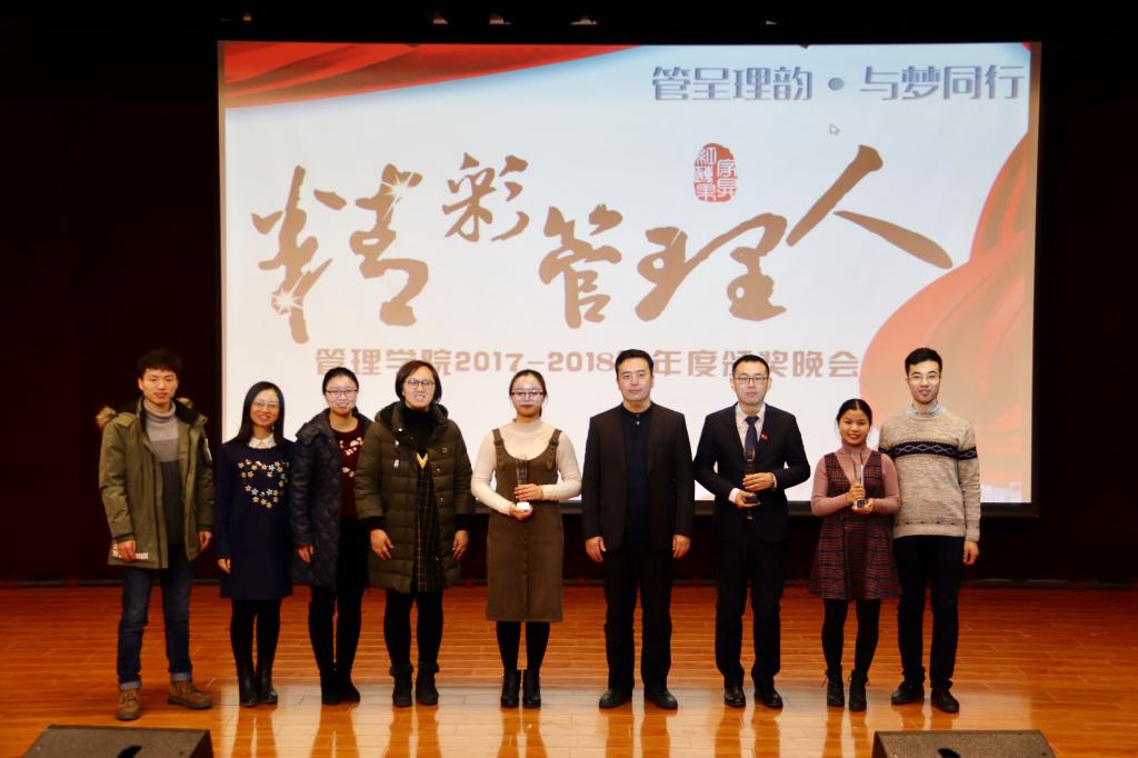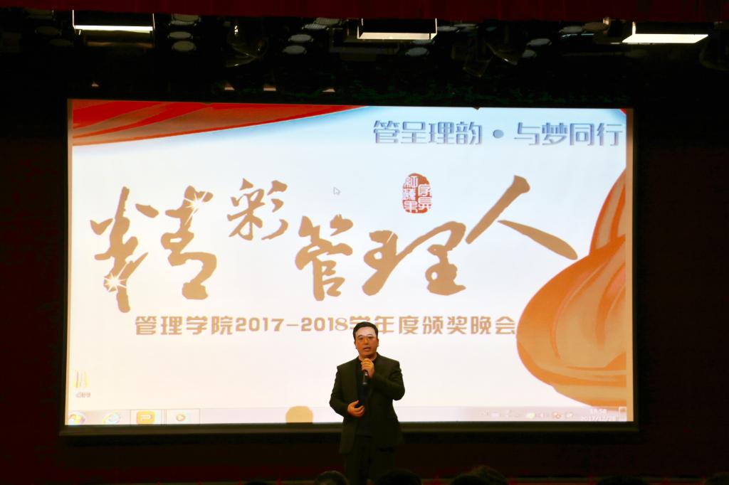 晚上7时,晚会正式开始。首先,杨庆舟作开场陈词,寄予了管院学子殷切的期望。之后,两位主持人以经典的“新闻联播”的形式回顾了2017年管理学院的精彩瞬间。随后播放了张亦冰、廖敏伶、江娜三位优秀管理人获奖者的采访短片,三位精彩管理人分别从学术科研、志愿支教、奋发励志三个不同方面分别讲述了自己特别的经历,向学弟学妹们展示身为一个优秀矿大学子的无限可能与精彩的学习生活,为管理学院的学子们树立了学习实践与校外活动完美结合的绝佳榜样,赢得了同学们的阵阵掌声。大会最后,杨书记为三个精彩管理人颁发了证书。