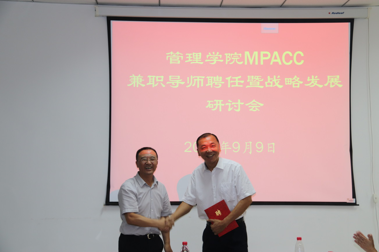 会议由管理学院赵院长负责主持,对各位参会专家进行了介绍。丁院长详细的介绍了管理学院MPACC专业学位设置、招生情况、学科与专业发展情况,并将MPACC专业的培养方案进行了说明,希望兼职导师今后能在人才培养、实习就业等方面给予学院更多的指导与帮助。校外导师一致认为对我校给予各位校外导师的信任表示感谢,并表示一定会认真履行导师职责,做好专业实务前沿讲座、论文指导、专业实习和推荐就业等兼职导师工作和任务。随后,丁院长为新聘任的校外导师颁发了聘书,对各位实务界专家的到来表示了热烈欢迎和衷心感谢。