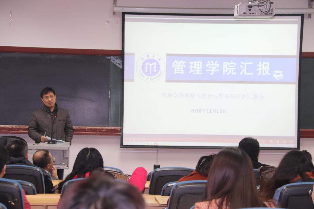 2018年11月13日,管理学院在理化楼103召开本科教学工作会议暨迎接审核评估汇报会,全院教职工参加会议,会议由院长丁日佳主持。
