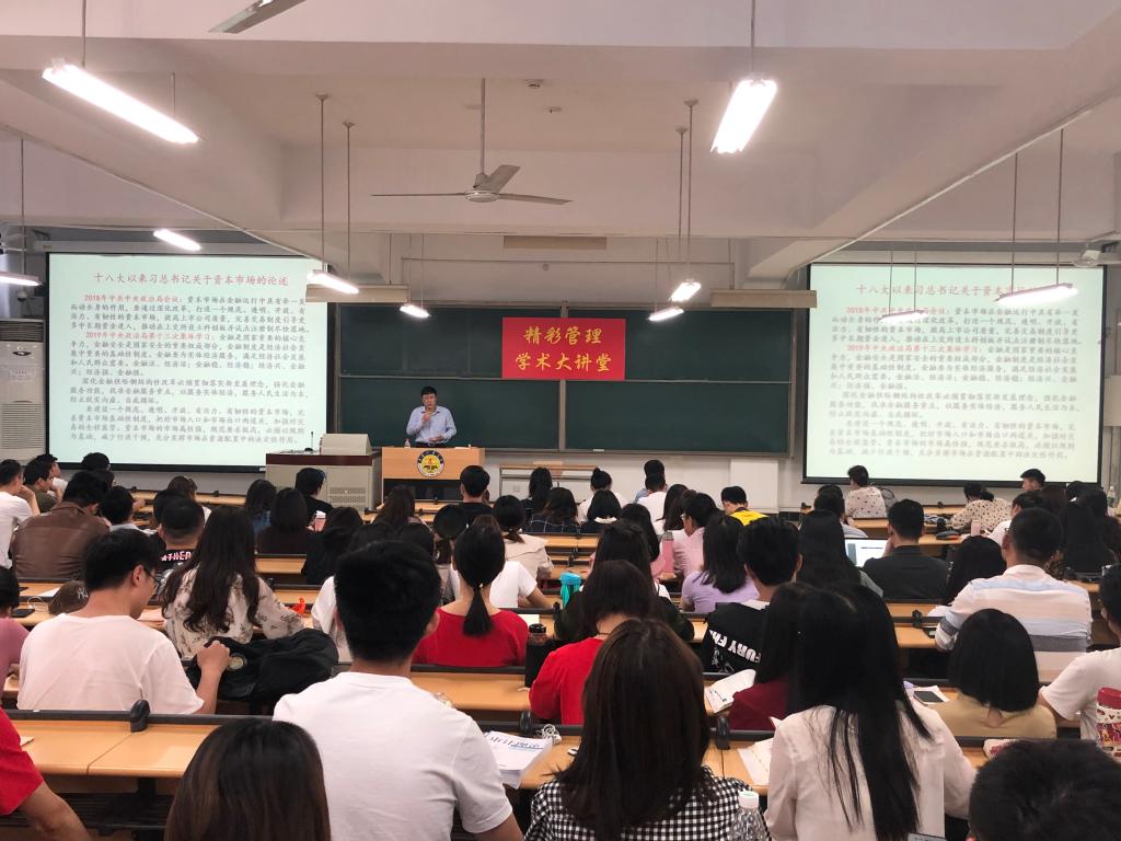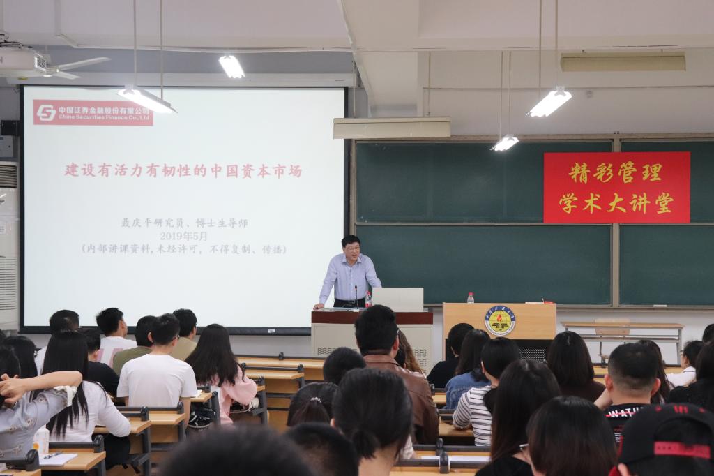 本网讯 2019年5月11日上午,管理学院于教学楼106举办“精彩管理学术大讲堂”系列讲座,学院邀请中国证券金融公司党委书记、董事长聂庆平作“建设有活力有韧性的中国资本市场”主题讲座,管理学院副院长赵学彬、工商管理系教授童磊主持会议、各系教师以及各专业200余名研究生与本科生生积极参加此次讲座活动。