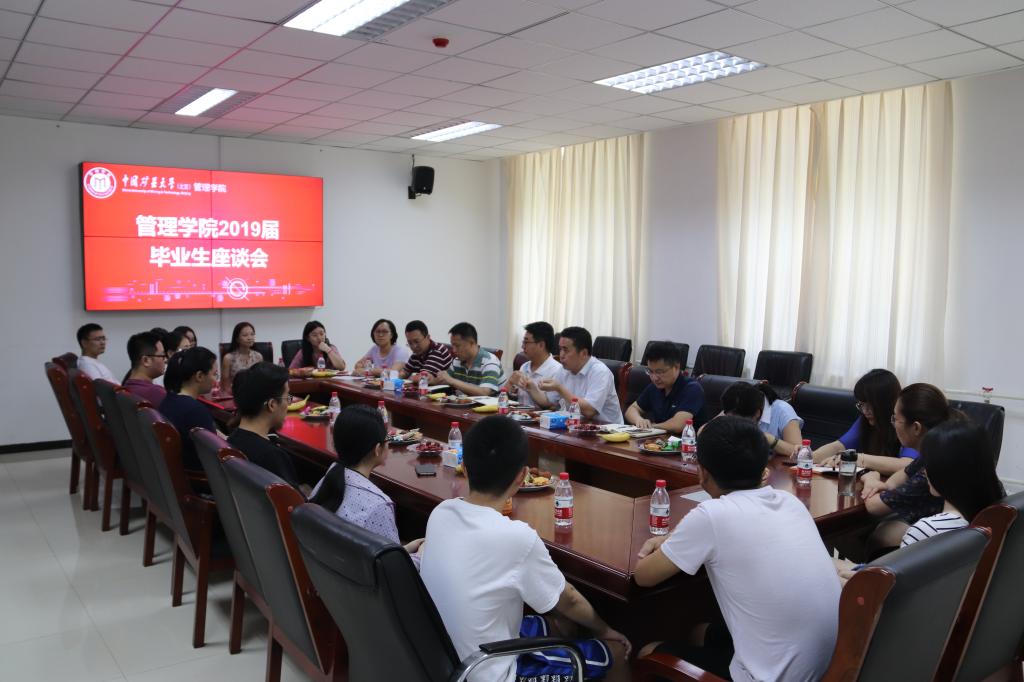 本网讯 6月20日下午,学院在理化楼103会议室召开了2019届毕业生座谈会,学院党委书记杨庆舟、副院长赵学彬、汪文生、工商系主任荆全忠、营销系主任黄辉、会计系主任张俊芝、本科生教秘王冬梅、学工办主任崔艳娜、团委书记李烁玮及本硕博毕业生代表14人参加会议。