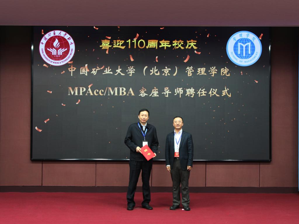 喜迎110周年校庆,2019年11月2日下午,“中国矿业大学(北京)管理学院2019年财经管理峰会暨MPAcc/MBA客座导师聘任及实践教学基地授牌仪式”在交流中心二层报告厅举行。管理学院院长丁日佳、副院长赵学彬出席峰会,一同莅临峰会现场的有中国神华物资集团总经理仝金正等五位首批客座导师代表、中国建设银行总行授信审批部副总经理级专职审批人蒋伯荣等三十一位本次获聘客座导师,以及中国盐业集团有限公司总会计师蒋占华等九家实践教学基地和一家产学研基地的领导,一同获聘的客座导师还包括因公无法出席的中国证券金融公司董事长聂庆平等二十五位业界专家。此次峰会由管理学院副院长赵学彬主持。