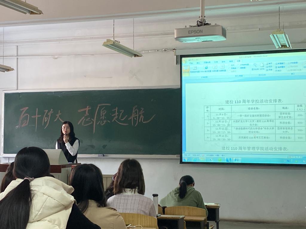 百十载风雨兼程,矿业学脉薪火相传。为提升志愿者服务校庆工作的水平,全面践行“奉献、友爱、互助、进步”的志愿精神,中国矿业大学(北京)管理学院于11月5日下午1点30分在理化楼205教室召开了校庆志愿活动启动暨培训大会。出席本次大会的有管理学院党委副书记李邦三、院学生工作办公室主任崔艳娜老师、院团委书记校友联络办公室主任李烁玮老师以及即将在校庆岗位上奉献的全体志愿者。