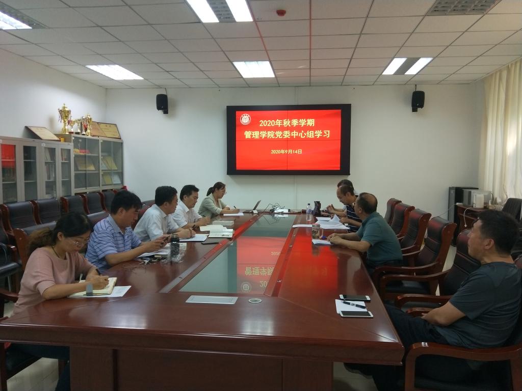 9月14日下午,在理化楼103会议室管理学院党委中心组开展了9月理论学习,院长丁日佳、副院长张瑞领学,党委书记杨庆舟、党委副书记李邦三、副院长赵学彬、尚煜、委员刘海滨、纪委委员王阳、崔艳娜参加了学习。