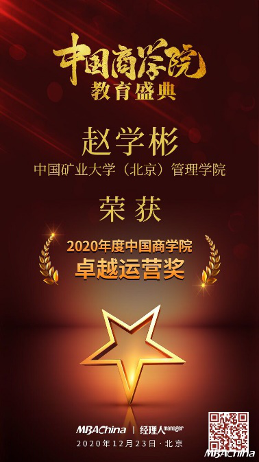 我校管理学院副院长赵学彬(MBA中心主任)、MBA中心常务副主任张志强、MBA中心主任助理裴超应邀出席。中国矿业大学(北京)管理学院荣获“2020年度中国商学院最佳MBA项目TOP100奖”、能源特色MBA项目荣获“2020年度中国商学院最具特色MBA项目奖”,赵学彬荣获“2020年度中国商学院卓越运营奖”。