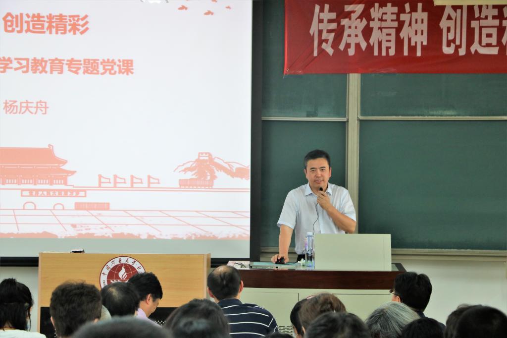 6月8日下午,根据学院党史教育学习安排,党委书记杨庆舟在教学楼209,为全院教职工、各学生党支部支部委员、团委及学生会主要学生干部176人讲授题为《传承精神,创造精彩》的专题党课。
