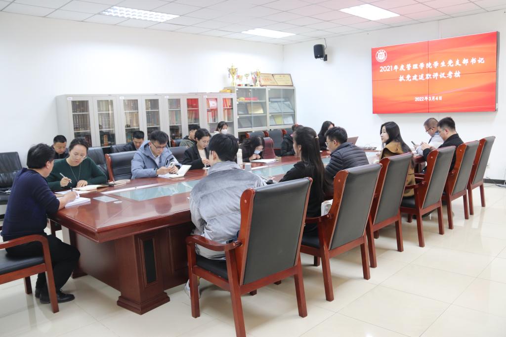 3月3日下午,管理学院2021年度学生党支部书记党建述职考核在理化楼103举行。会议通过线上线下结合形式开展,22名学生党支部书记进行了述职,学院党委副书记李邦三和61名学生党支部委员参与此次述职考核。会议由党委专职组织员崔艳娜主持。