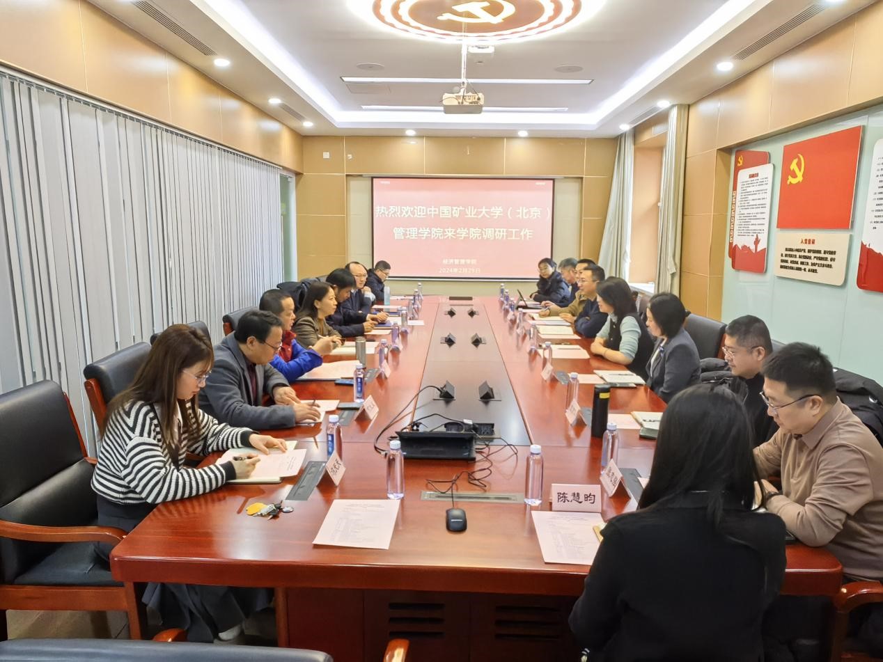 2024年2月29日,管理学院党委书记高洁、副院长黄辉、副院长杨洋,工商管理系党支部书记、系主任、系副主任,及会计系系主任、MBA教育中心执行主任一行,赴中国地质大学(北京)经济管理学院开展党建调研交流活动。中国地质大学(北京)经济管理学院党委书记孙敬,院长吴三忙,副院长雷平、高湘昀,及相关部门负责人参加调研交流活动。