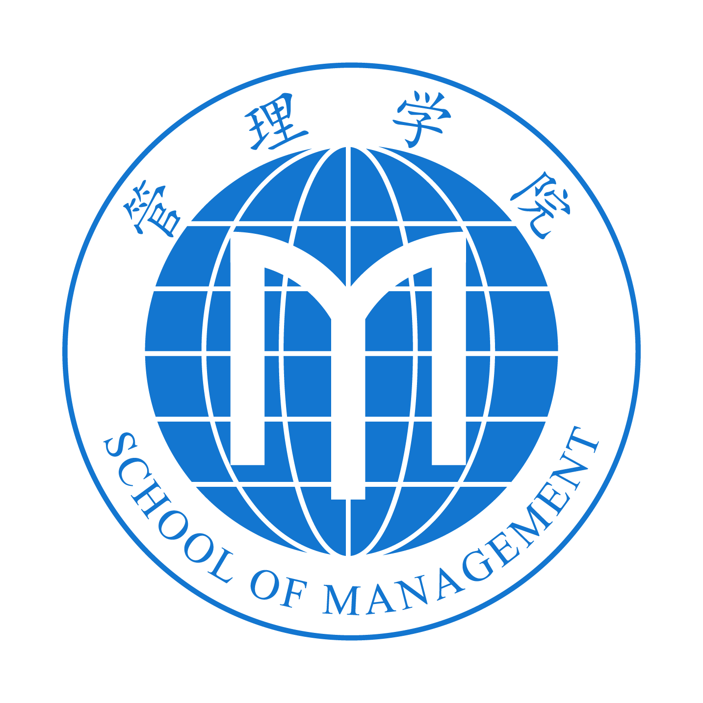 院徽整体是一个由中文管理学院、英文SCHOOL OF MANAGEMENT、地球元素以及管理的英文MANAGEMENT首字母M变形构成的圆形图标。